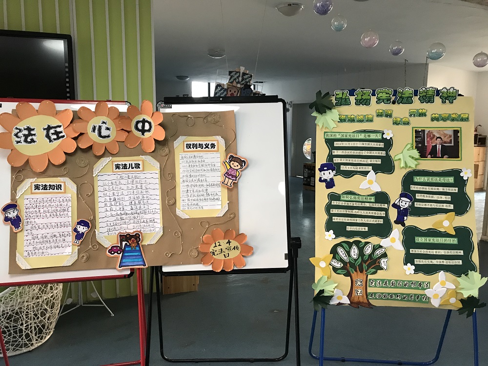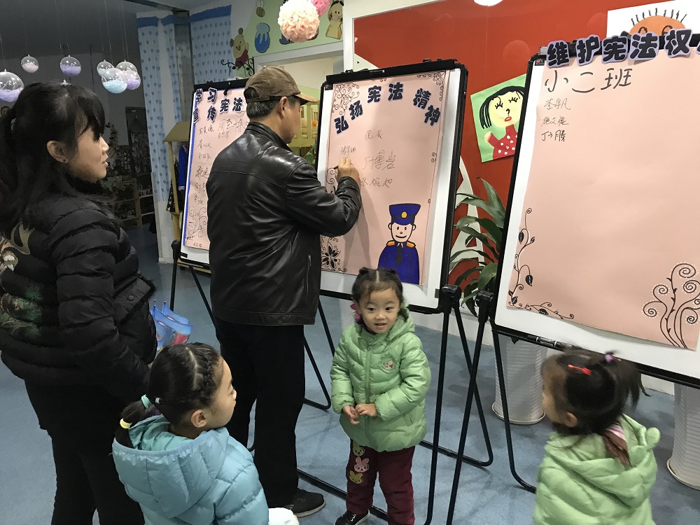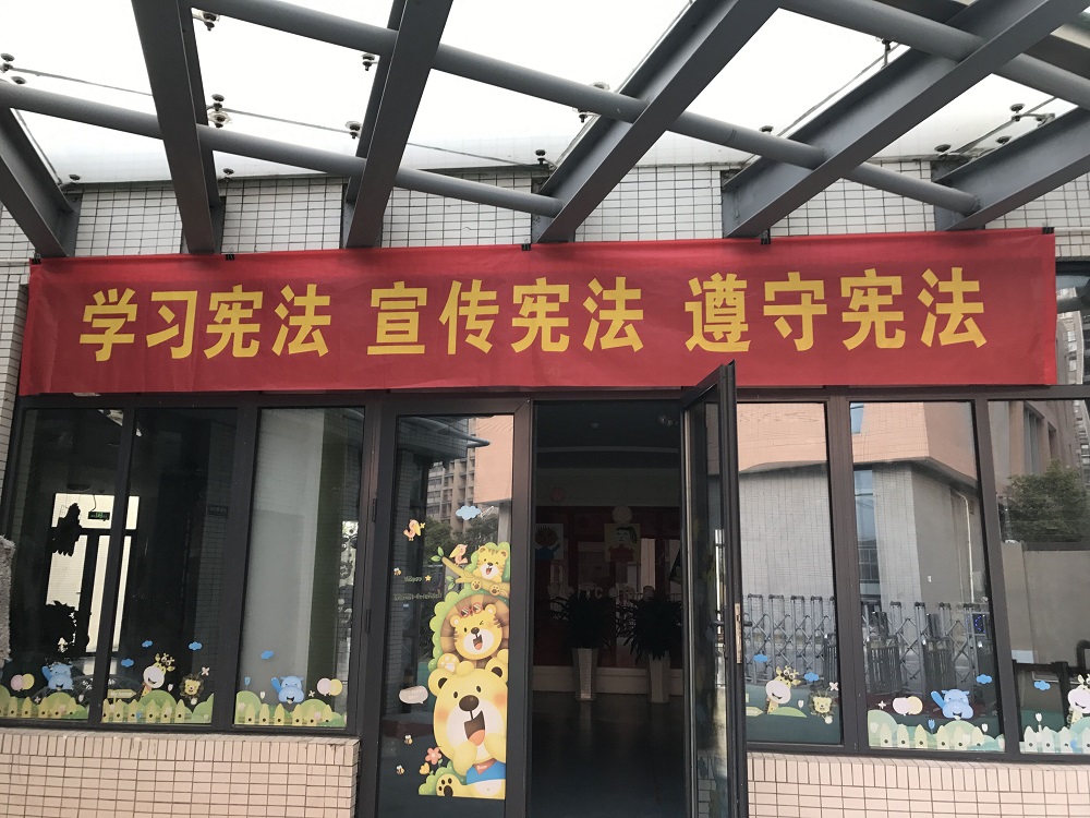 为了贯彻落实党的“十九大”精神,大力宣传以“宪法”为核心的中国特色社会主义法律体系,深入开展全区依法执政、依法治校、依法执教工作,进一步增强我园师幼的法制观念和法律素质,营造和谐、稳定的校园环境,打造“遵纪守法、乐于奉献”的教师队伍;提高幼儿明辨是非、依法自我保护的能力。结合我园实际,开展本次宪法宣传,本次宪法宣传月活动的主题是:“深入学习宣传宪法,大力弘扬法治精神”。我园利用了教师国旗下讲话、以法制教育为主题的宣传栏、QQ、家校互动平台等各种形式,幼儿园在显要位置悬挂法制宣传标语,营造一种浓厚的宪法宣传氛围,组织教师集中学习宪法知识并进行宣誓,我园的各年级组还通过制作宪法宣传教育海报,组织家长在晨检过程中进行投票,选取最喜欢的一幅海报,在幼儿园大厅创设一组签名墙,让幼儿与家长在上面签名,从而让宪法教育走进每个家庭,让知法、守法的家长成为孩子们身边最直接的榜样与表率,达到向幼儿言传身教的目的,从而形成幼儿园、家庭、社会“三位一体”的法律、安全、道德教育格局。